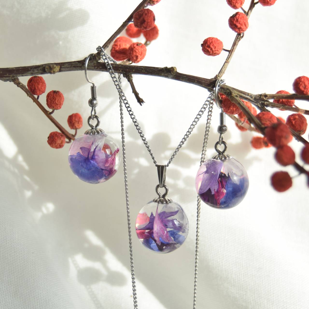 Speciální, zvýhodněný, nejen dárkový set. Kombinace malého náhrdelníku a kuličkových náušnic potěší nejednu ženu. Chrpy patří u Nature ID k nejoblíbenějším květinám.
